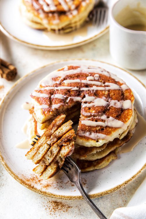 Indulge in our Cinnamon Roll Pancakes, fluffy protein pancakes with cinnamon flavor and low-fat cream cheese for a balanced and delicious breakfast treat.