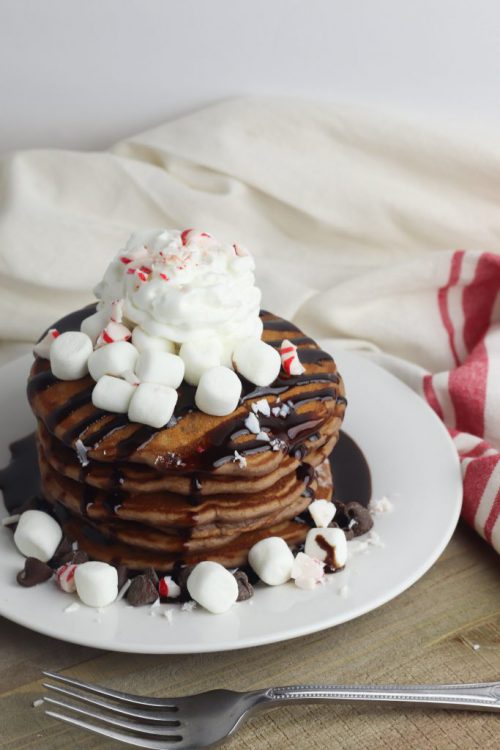 Indulge in our Hot Cocoa Protein Pancakes, featuring double dark chocolate flavor and a fluffy marshmallow topping for a sweet, protein-packed treat.